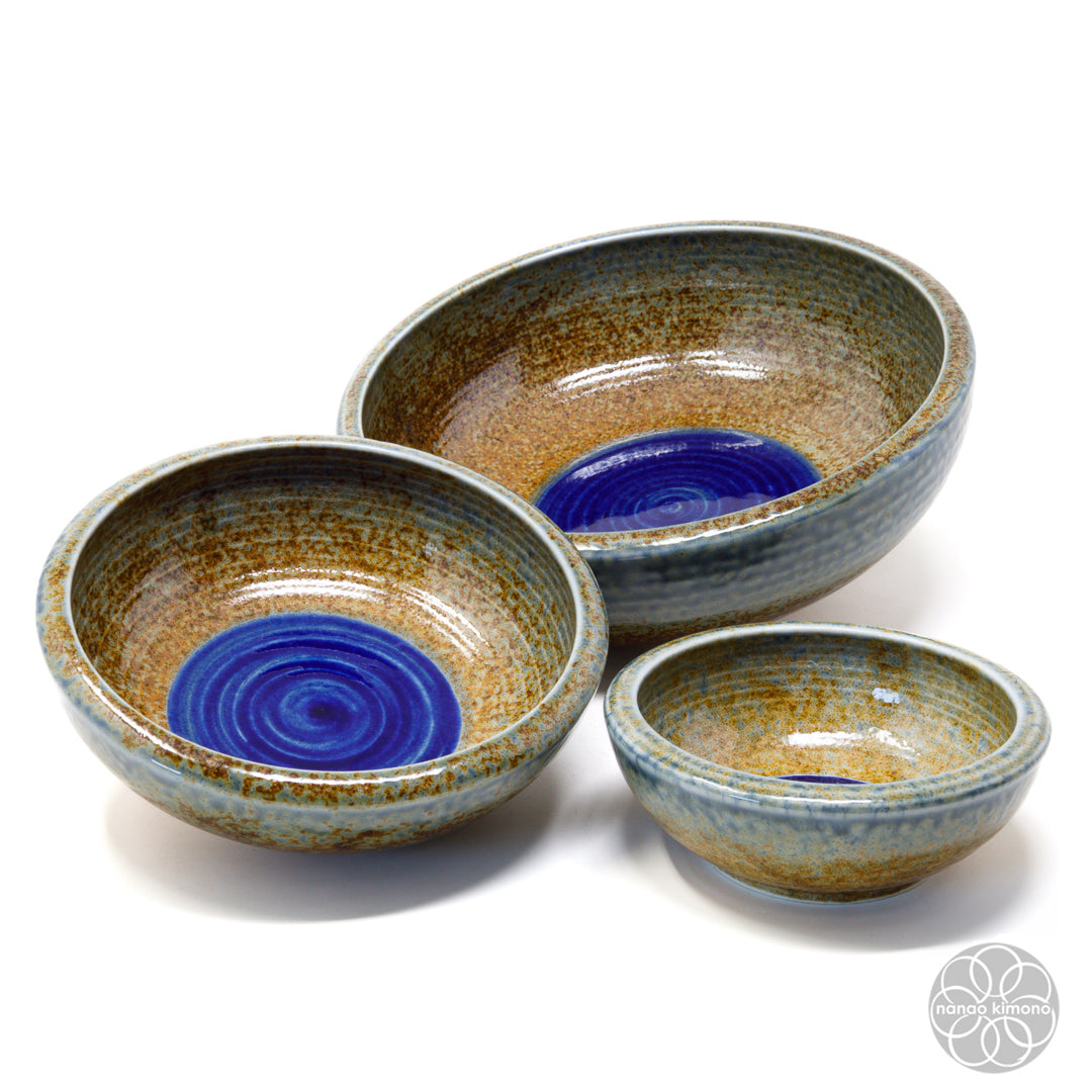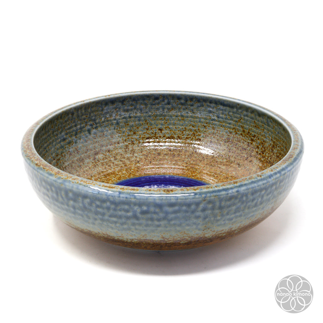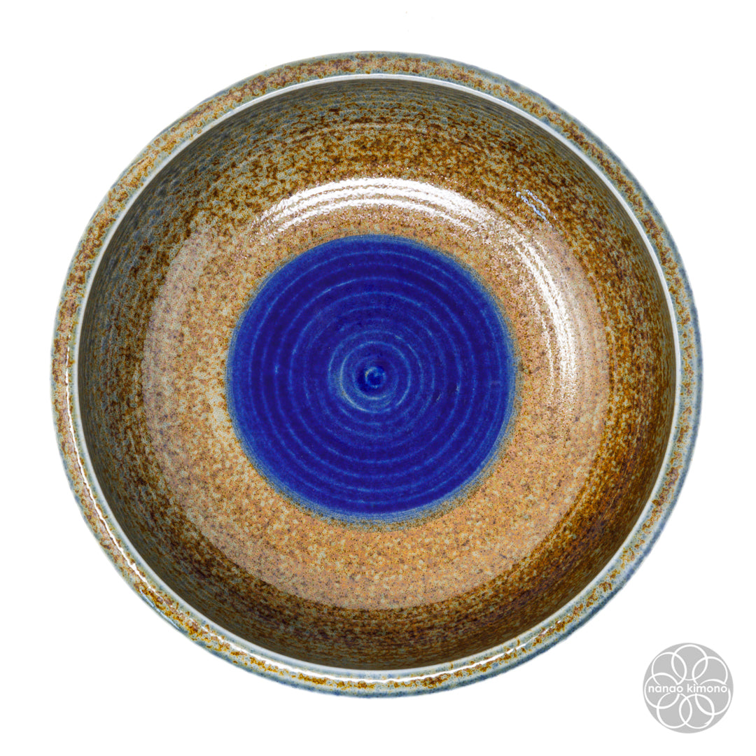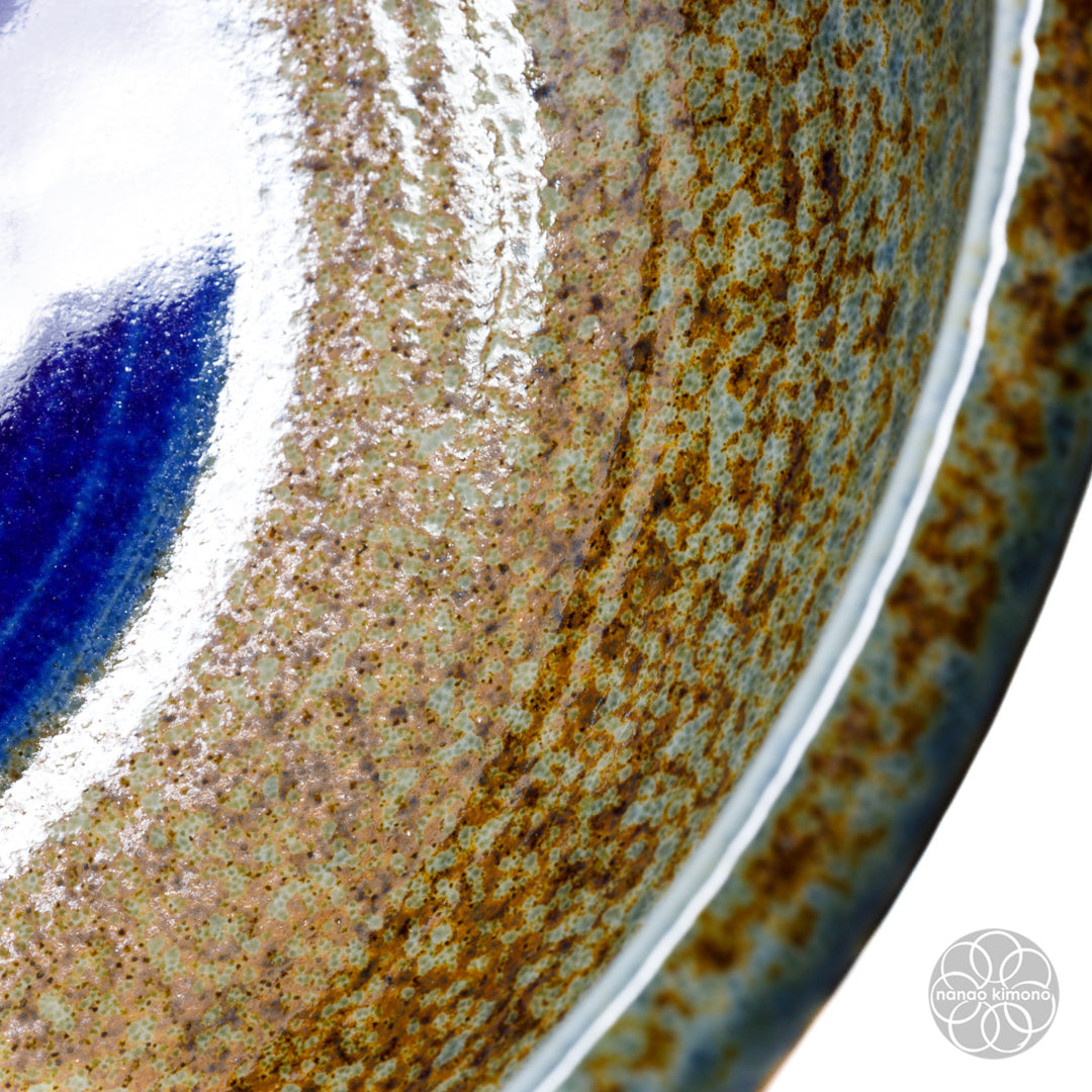 Sunaji Ainagashi (砂地藍流し) is a ceramic glazing technique used by artisans combining different types of glazes to create unique textures and colours. For this particular piece, an indigo/blue glaze is applied on the rim to mimic the flow of water over a warm brown sandy-textured surface.